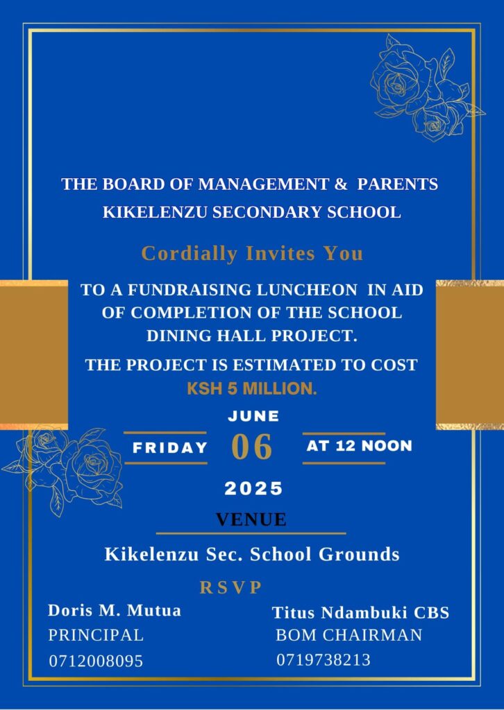 The Board of Management and Parents of Kikelenzu Secondary School cordially invite you to a fundraising luncheon in aid of the completion of the school dining hall project.